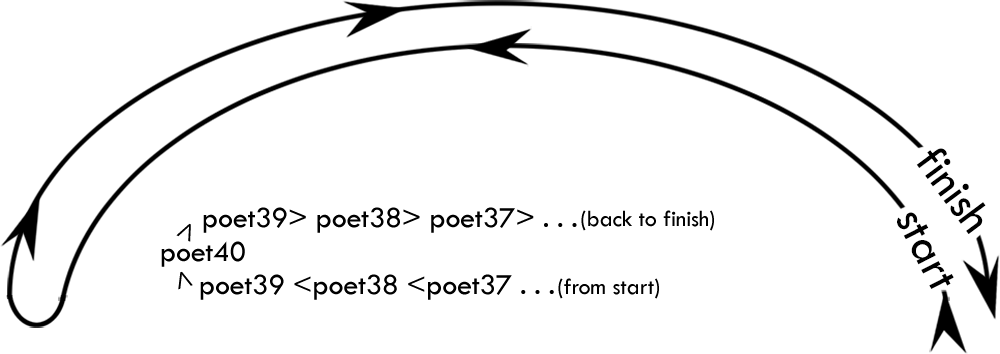 In the example below poet #1 writes a short poem and shares only the last word with the next poet in line. Poet #2 writes a short poem using the word (or a variation on it) as their first word. The poet #2 passes along only the last word to the next poet. And so on . . .